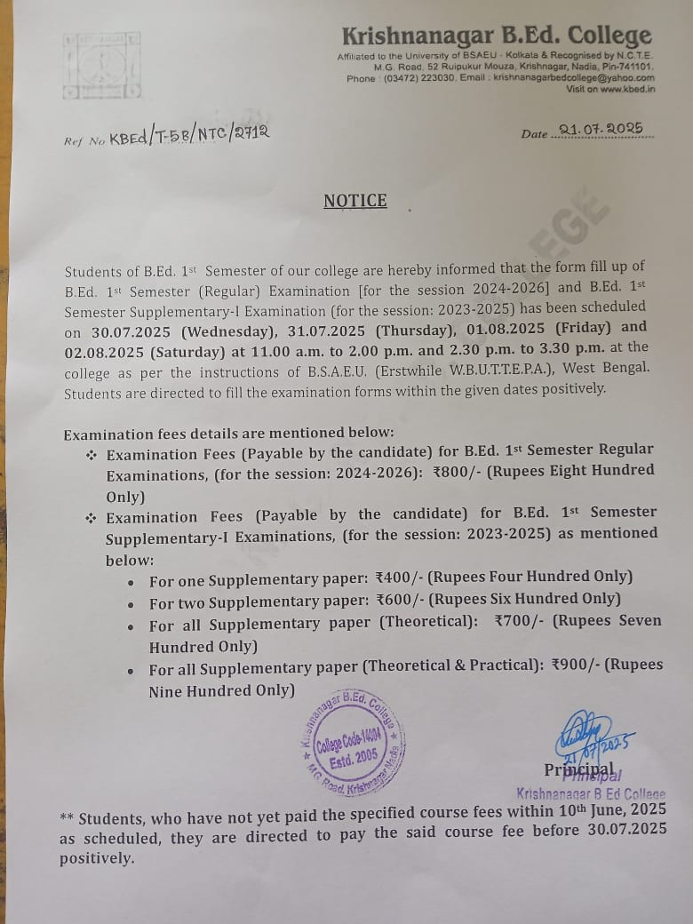 named as “Krishnanagar B.Ed College” on 4th August, 2005. The college is managed and run by the “Bibhuti Bhusan Bandapadhya Philanthropic