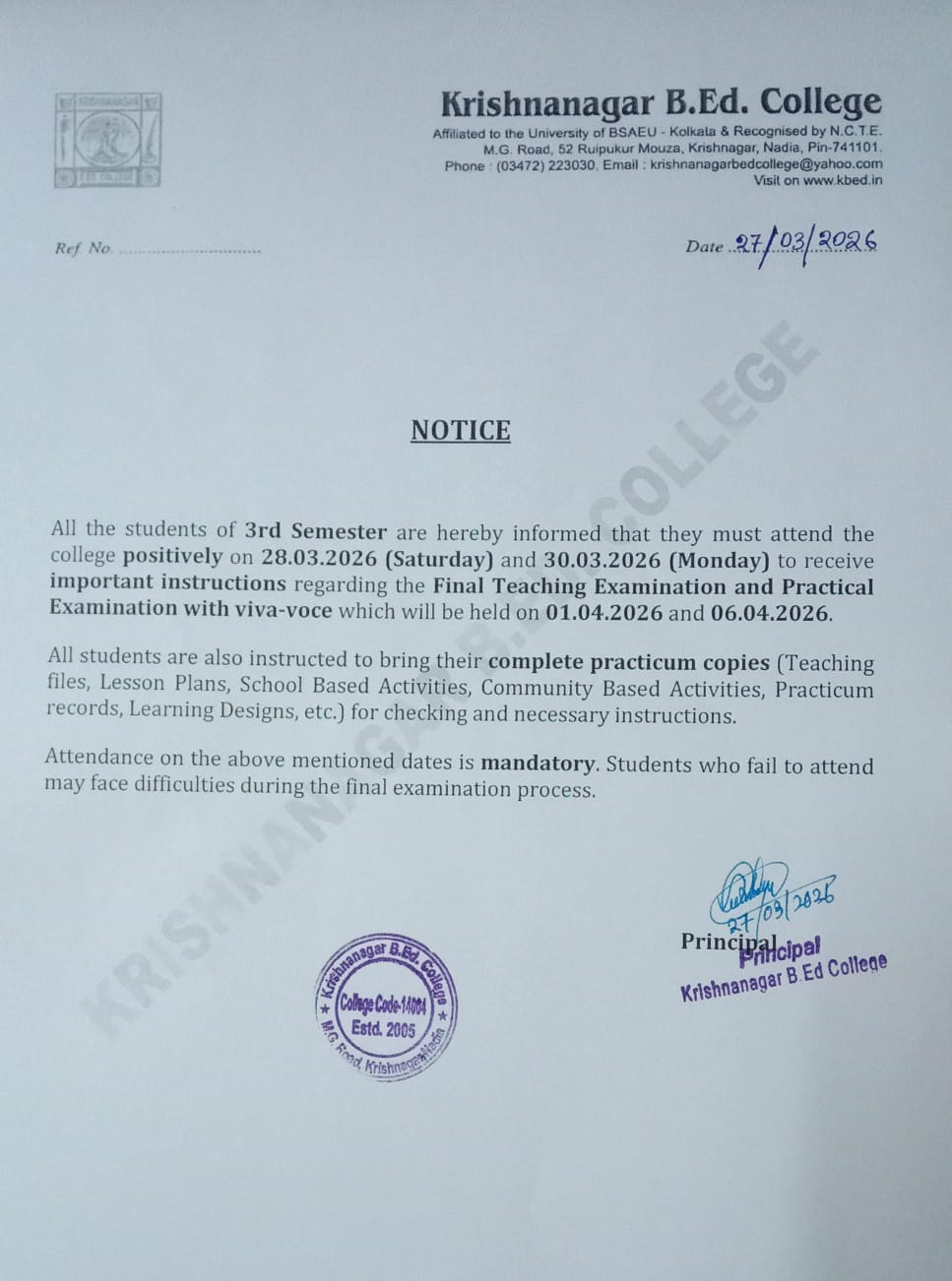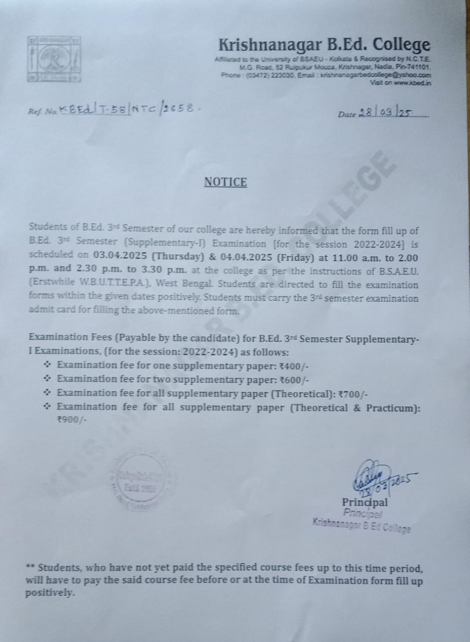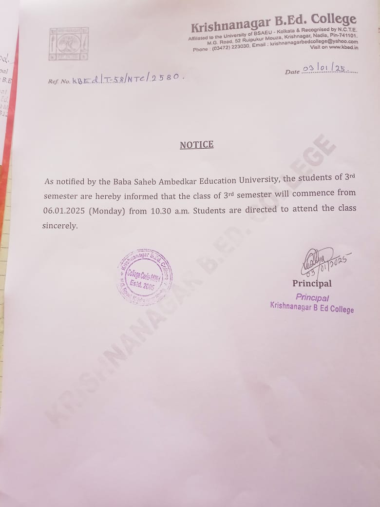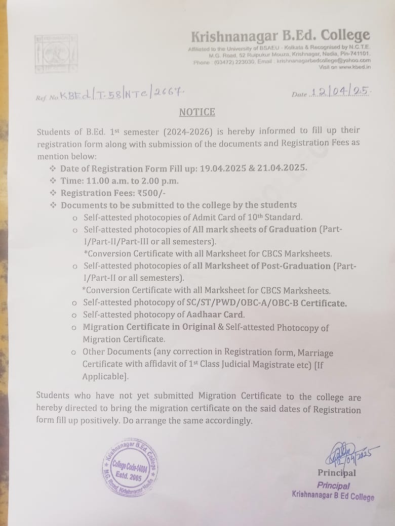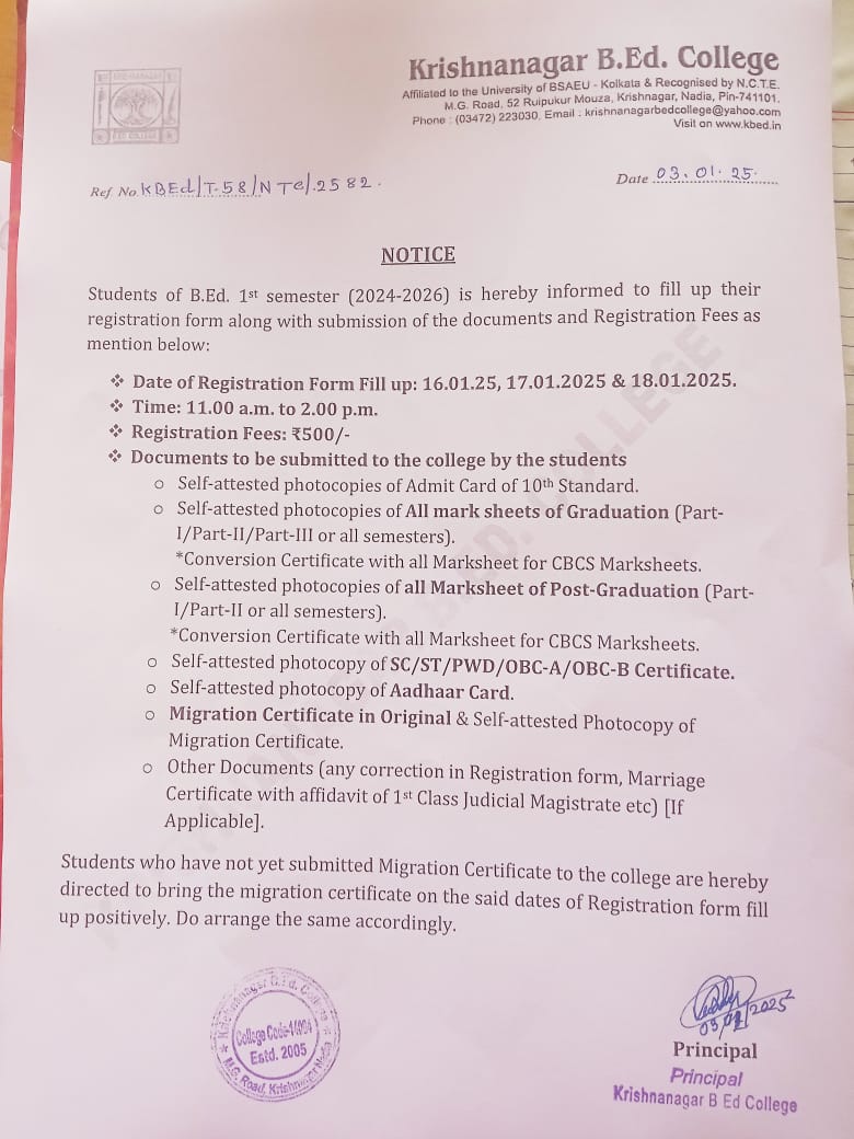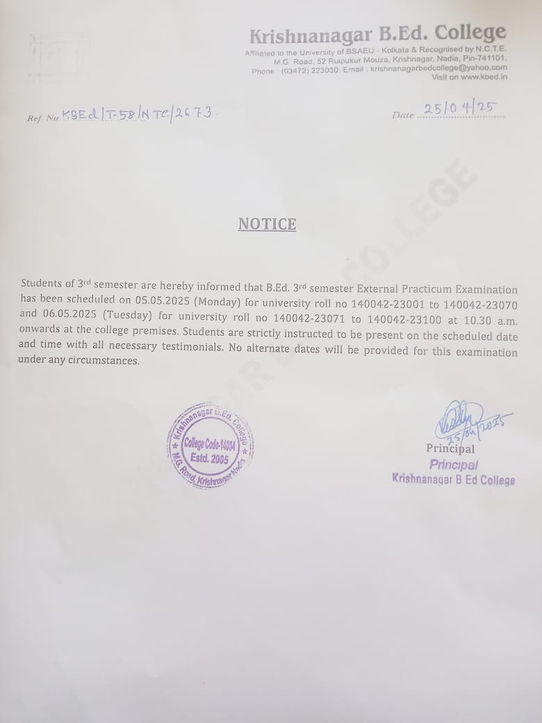 Krishnanagar B.Ed College is ideally situated in a completely noise-free area of the city, as well as is easily accessible from the rail