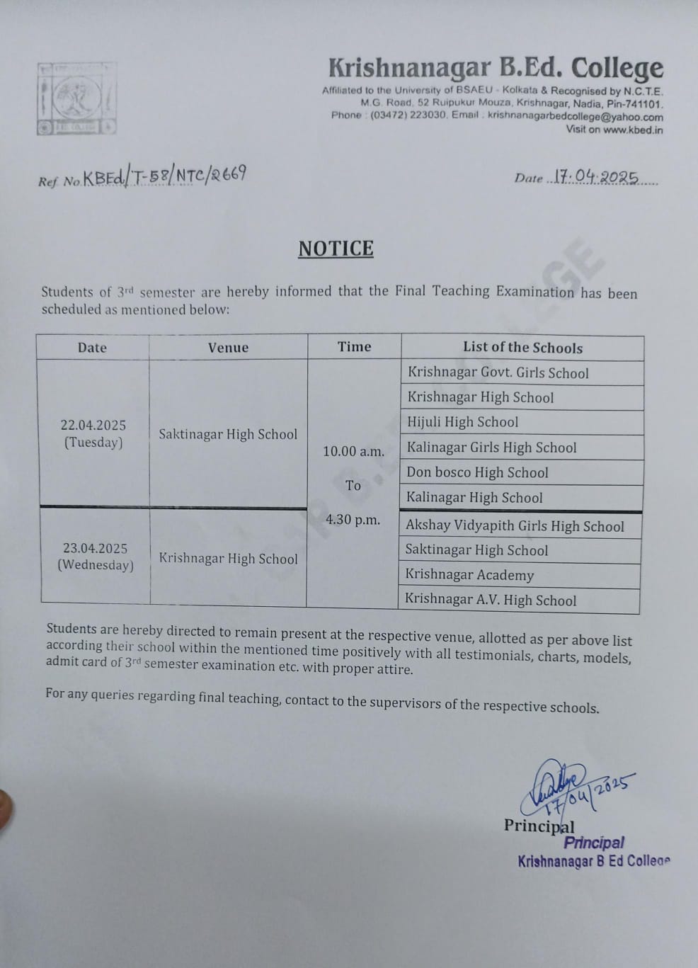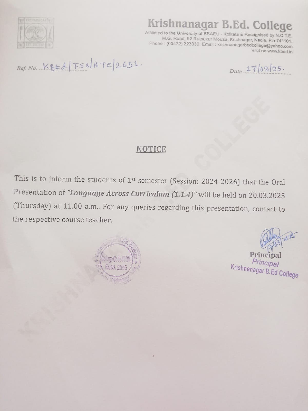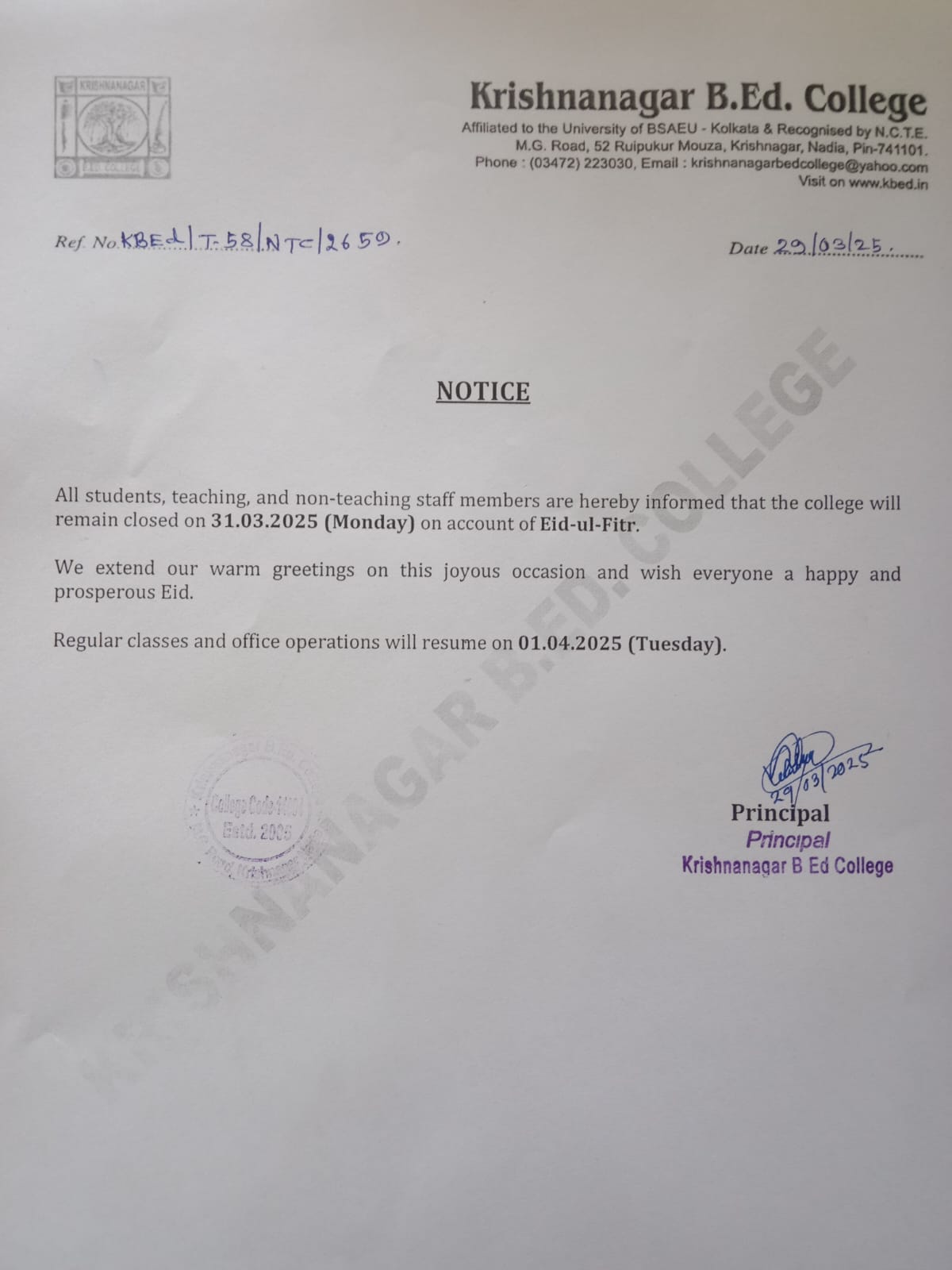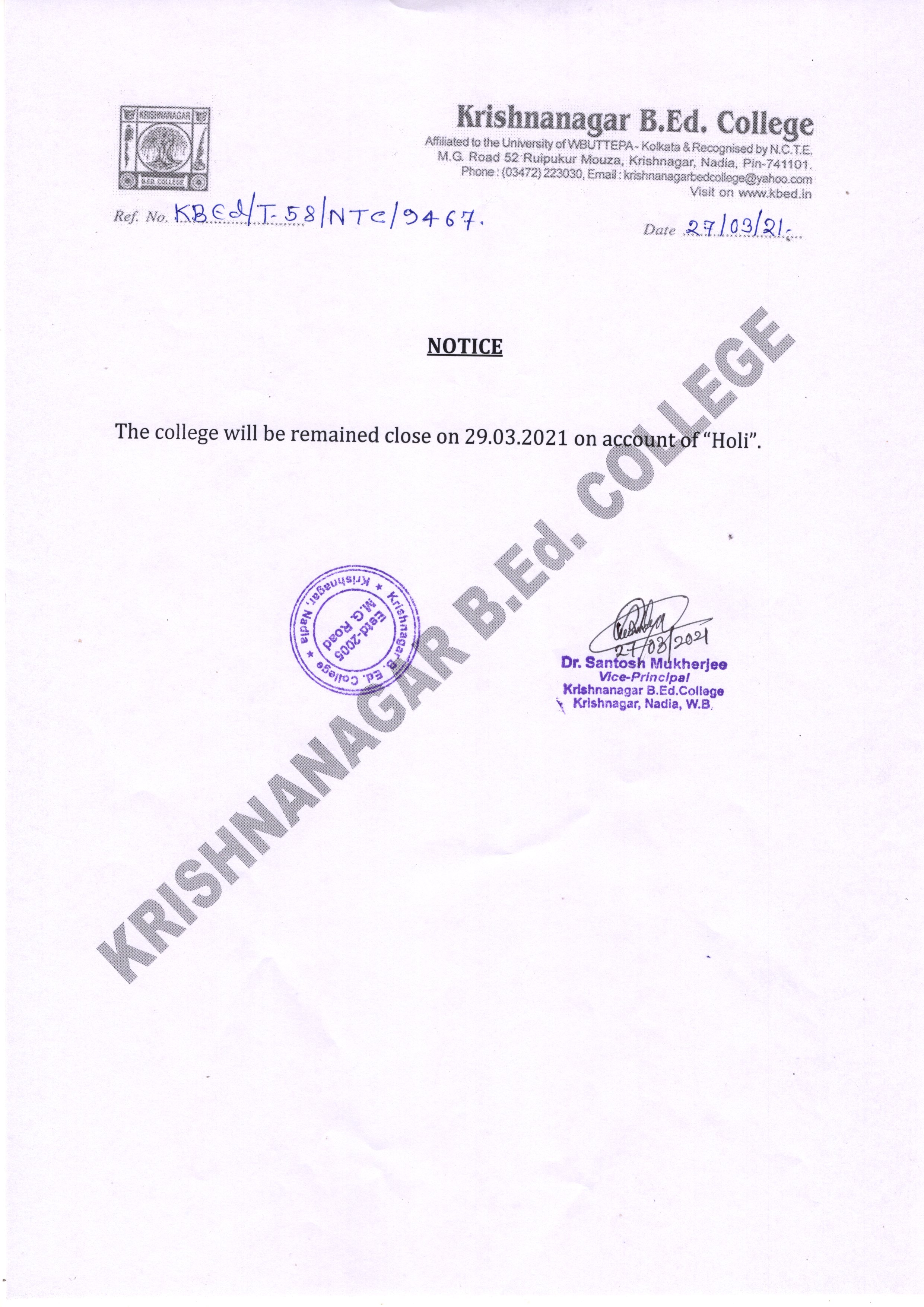 Krishnanagar B.Ed College is ideally situated in a completely noise-free area of the city, as well as is easily accessible from the rail